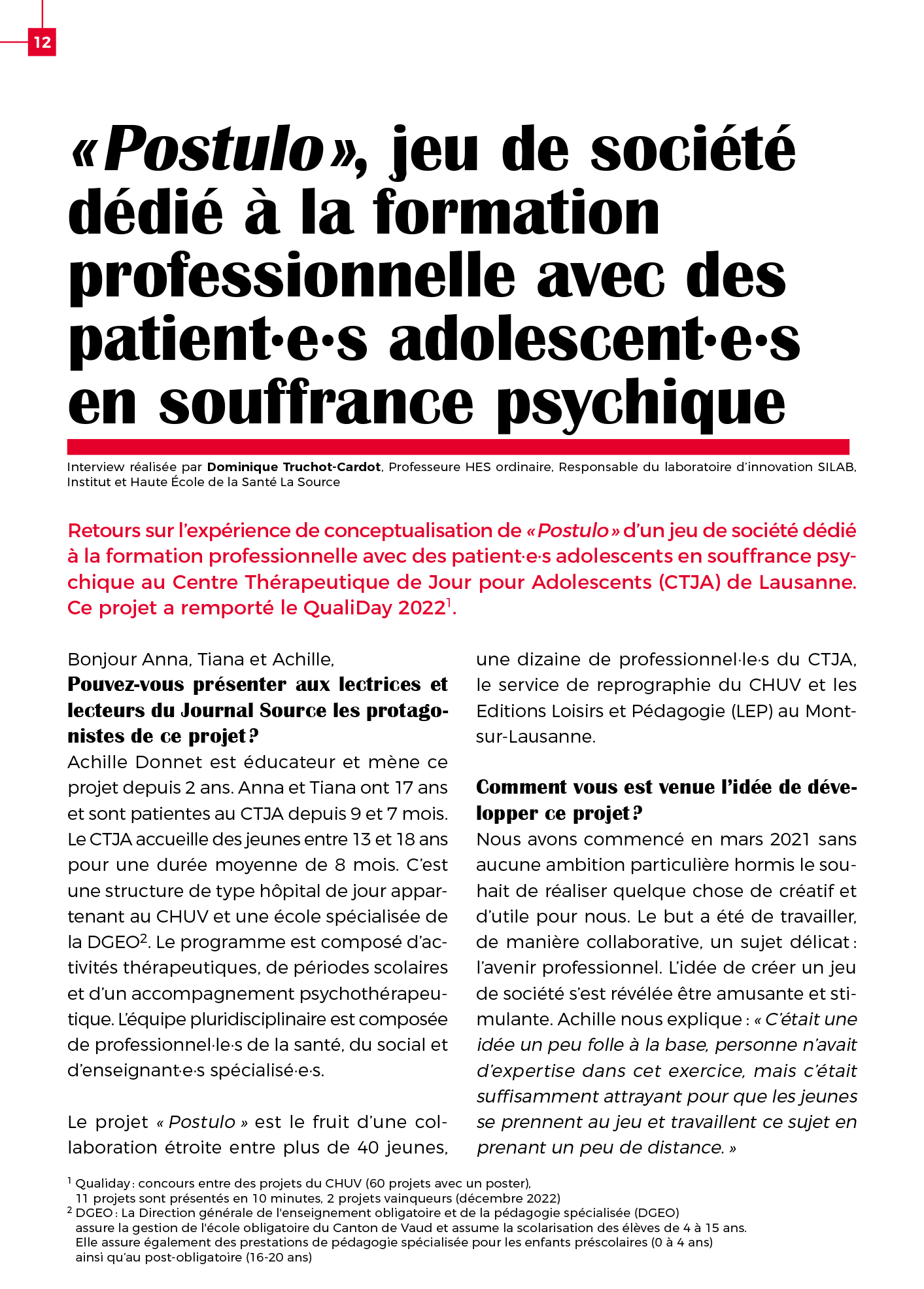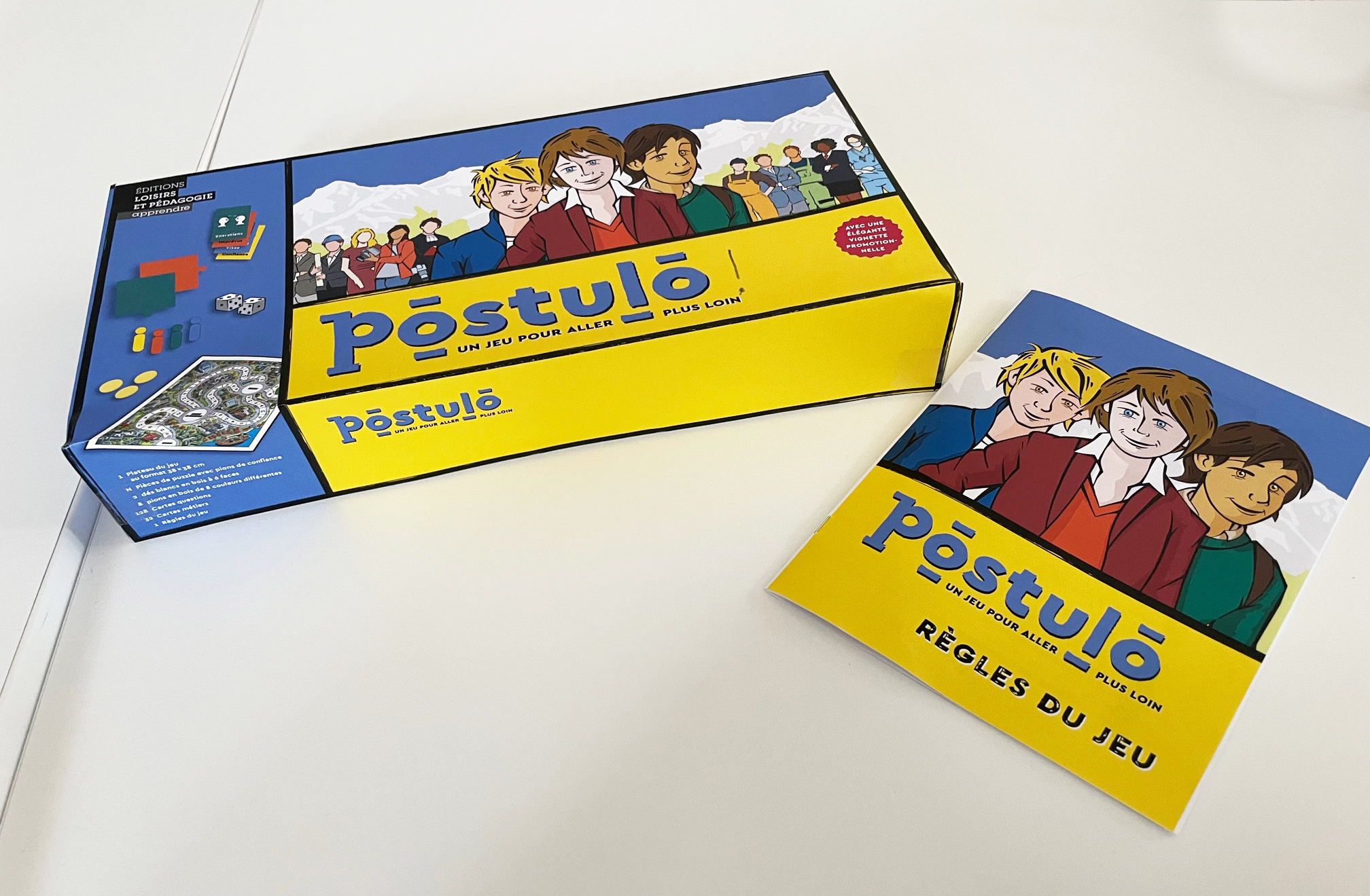 « Postulo » est un jeu de société imaginé par M. Achille Donnet, éducateur au Centre thérapeutique de jour pour adolescents (CTJA) du Service universitaire de psychiatrie de l’enfant et de l’adolescent (SUPEA) du CHUV, qui vise à accompagner les adolescent·e·x·s dans la découverte des démarches professionnelles à venir.